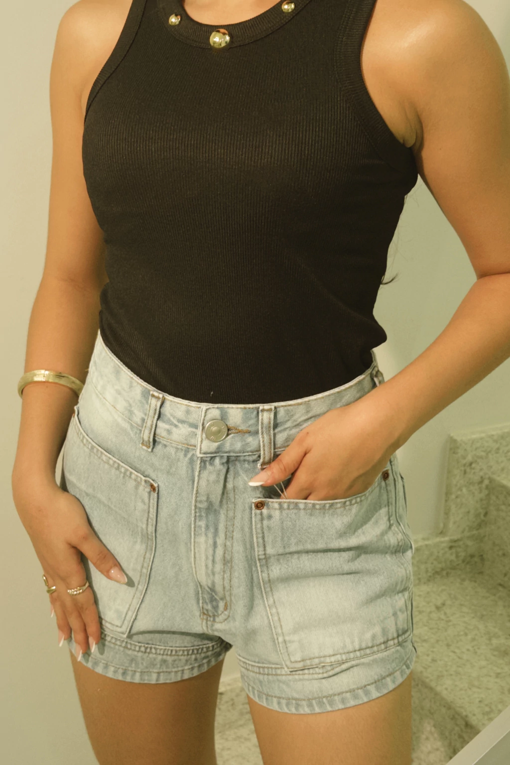 O preto é eterno, mas quando encontra o brilho sutil do dourado, nasce algo memorável. A Regata Servilha é feita em malha canelada com caimento ajustado e confortável. Seu decote arredondado é adornado por aplicações metálicas douradas, criando um ponto de luz que eleva a sofisticação sem esforço.